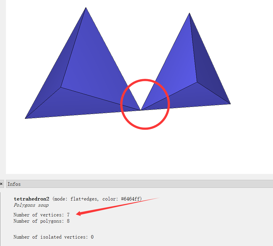 T 型结(T-junction)是指一条边的端点连接到另一条边的中间位置,而不是连接到顶点。顶点4在边(0,1)上,边(2,4)与边(0,1)形成了一个”T“,所以被称为T 型结。其实这也可以算破洞,只不过破洞面积为0。