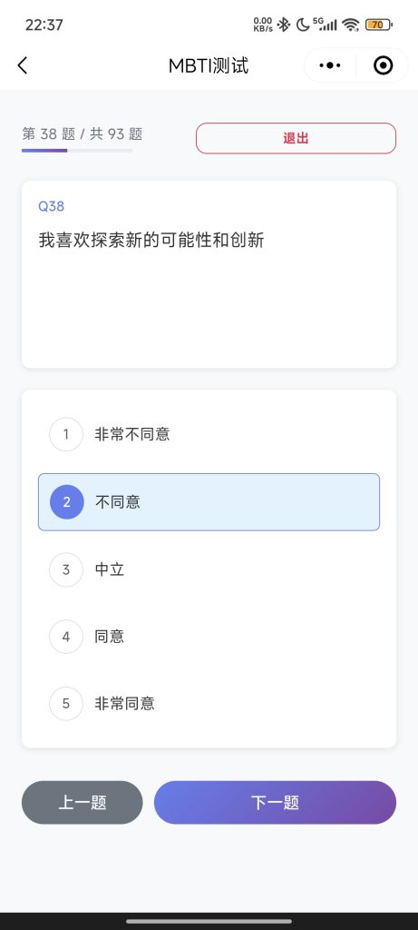 答题界面采用了5级Likert量表设计,从"非常不同意"到"非常同意",确保测试结果的科学性和准确性。最让我满意的是进度保存功能——用户可以随时中断测试,下次打开时自动恢复到上次的进度。