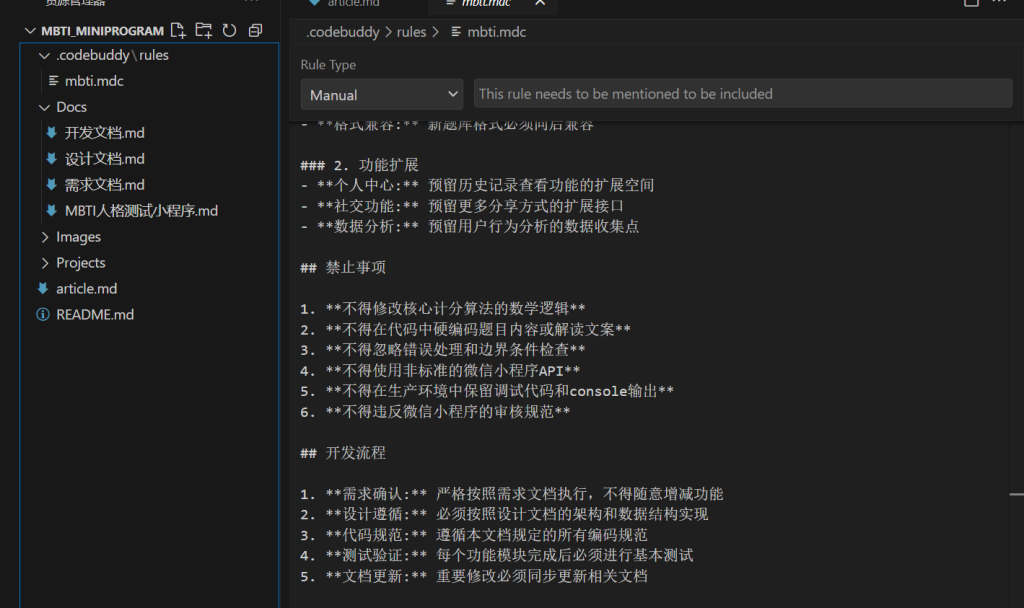 最近完成了一个让我颇为满意的项目——基于微信小程序的MBTI人格测试应用。整个开发过程中,AI助手发挥了关键作用,今天想和大家分享这个项目的开发历程,以及一些实用的AI提示词技巧。