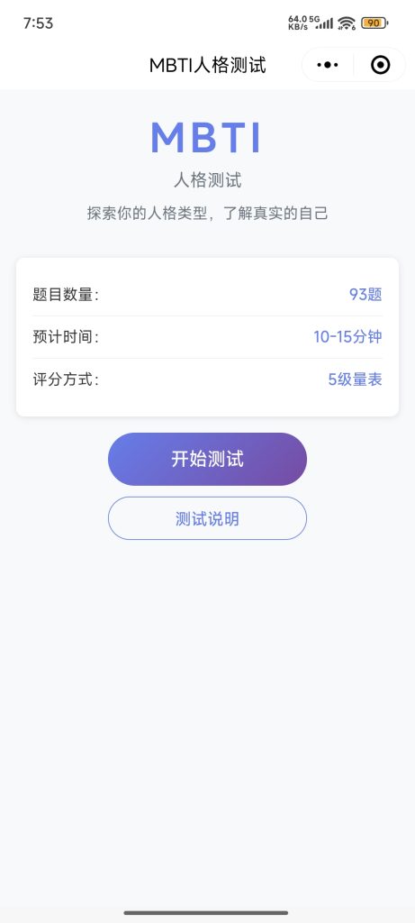 - 93道标准MBTI测试题目,覆盖四个维度(EI、SN、TF、JP)