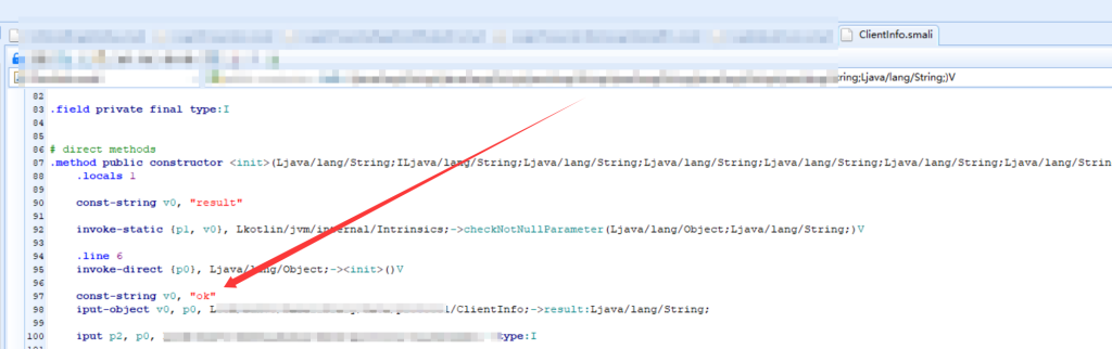 然后检测代码是判断result是否为"ok",如果为"ok"则更新许可信息并进入app,这也太简单了吧,直接把smali代码中ClientInfo构造函数的result改为"ok"。