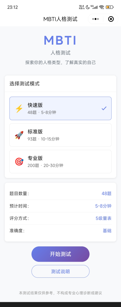 之前只有93题版本,说实话,我自己测试的时候都觉得有点长。现在这个快节奏的时代,谁有耐心做93道题啊😂 所以这次升级直接整了三个版本: