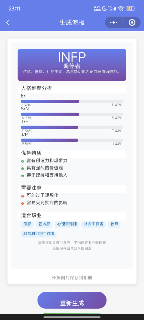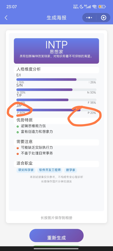 之前版本还有个让人头疼的问题,就是测试结果页面显示的人格维度占比和生成的海报里面的占比不一致。