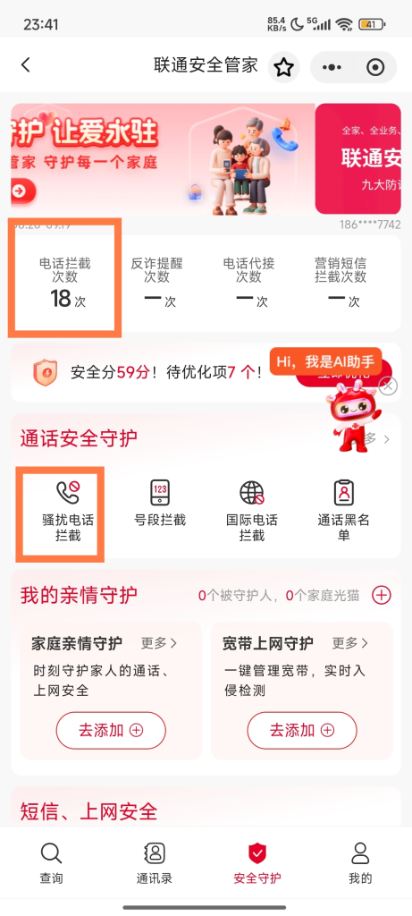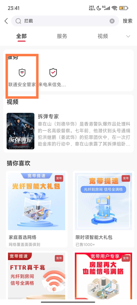 过了几天我突然想起来,之前好像设过联通的骚扰拦截。打开联通app一搜索"拦截":